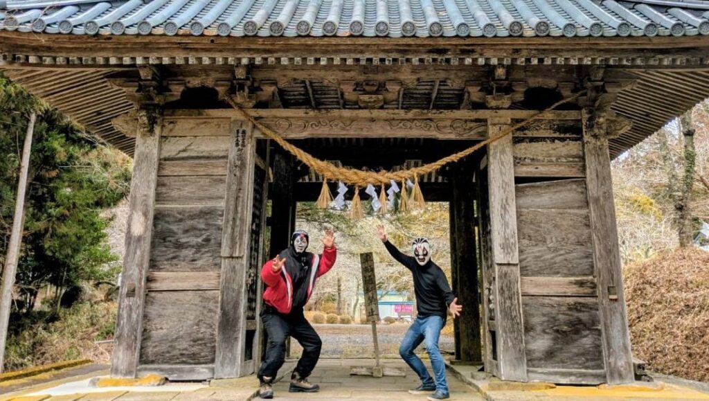山門でまるで阿形吽形像のようにポーズするマスブチ仮面とその弟子。