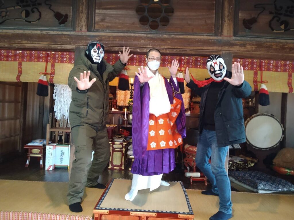 住職の左右で、ポーズを取るマスブチ仮面とその弟子。まさかの住職まではいポーズ!そんなお茶目な住職です。