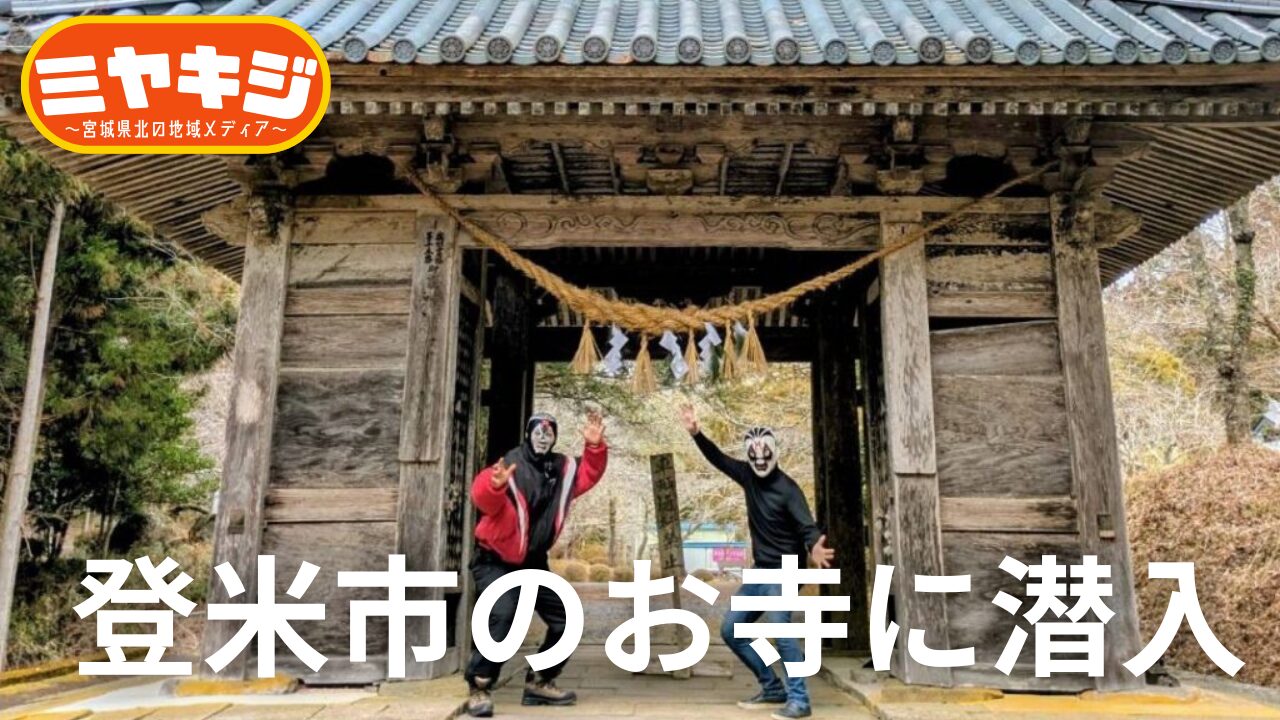 山門でまるで阿形吽形像のようにポーズするマスブチ仮面とその弟子。
