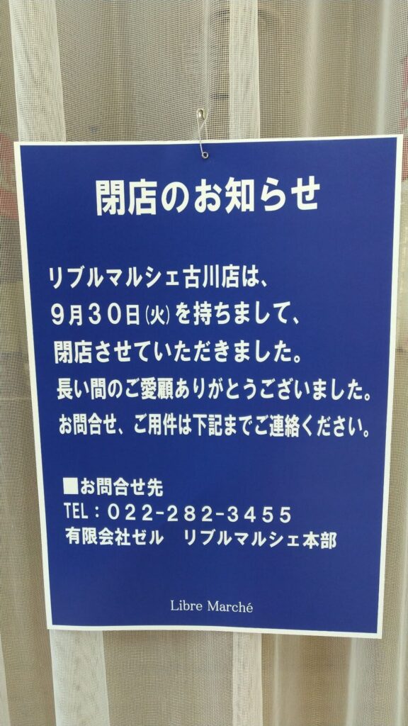 イオン古川店1階にある生活雑貨や服、お菓子やアクセサリーなどを販売していた【リブルマルシェ古川店】が9月30日で閉店していました。