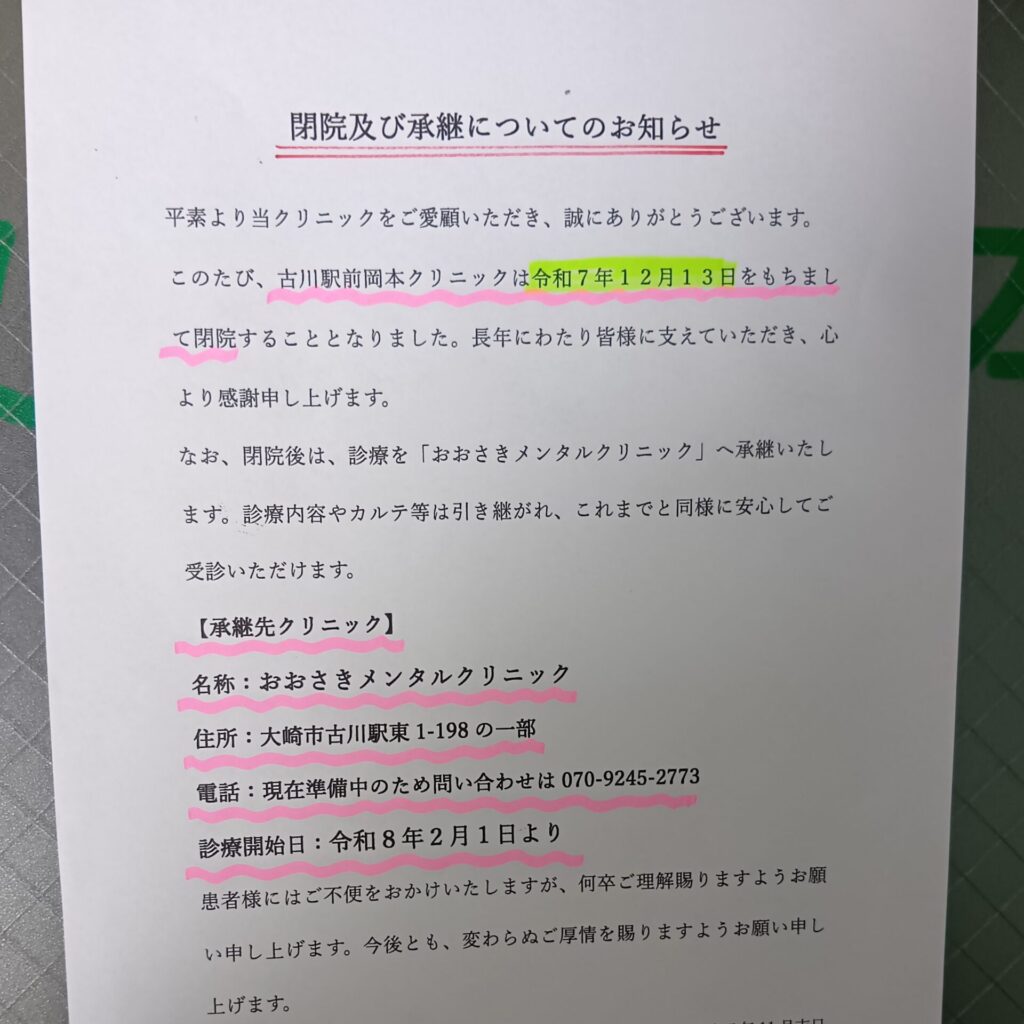 診療は「おおさきメンタルクリニック」に承継とのこと。