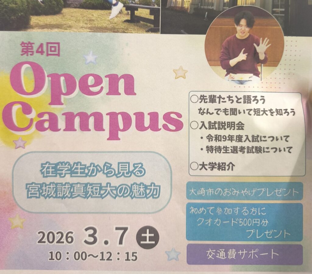 3月7日、大崎市唯一の短大、誠真短期大学にてオープンキャンパスが行われるとのこと。