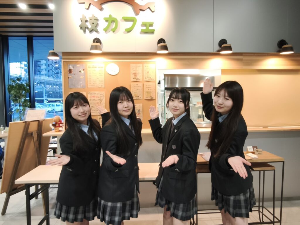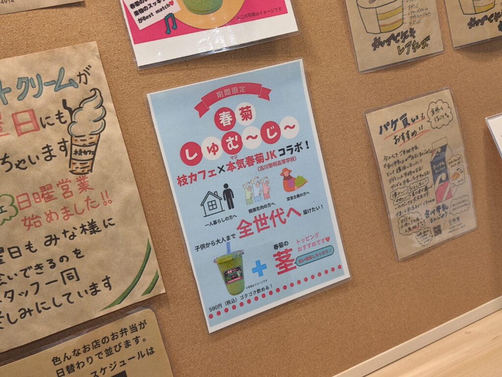 実は春菊のスムージーを考案したのは古川黎明高等学校の生徒さんたちなのよ。枝カフェとのコラボが決定したことで販売することになったんだって。