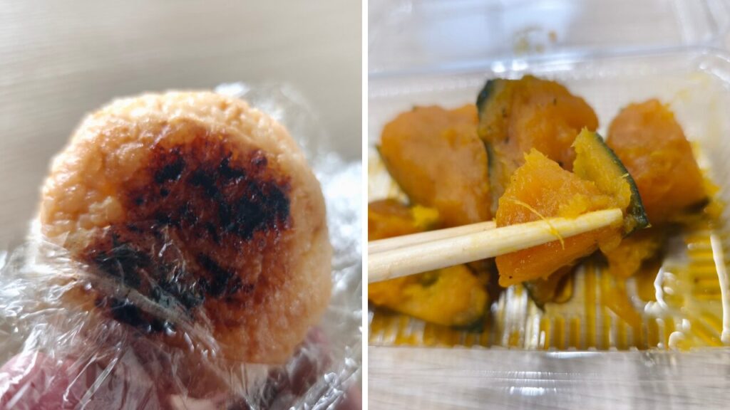 仙台味噌おにぎり150円と、かぼちゃの煮物200円。