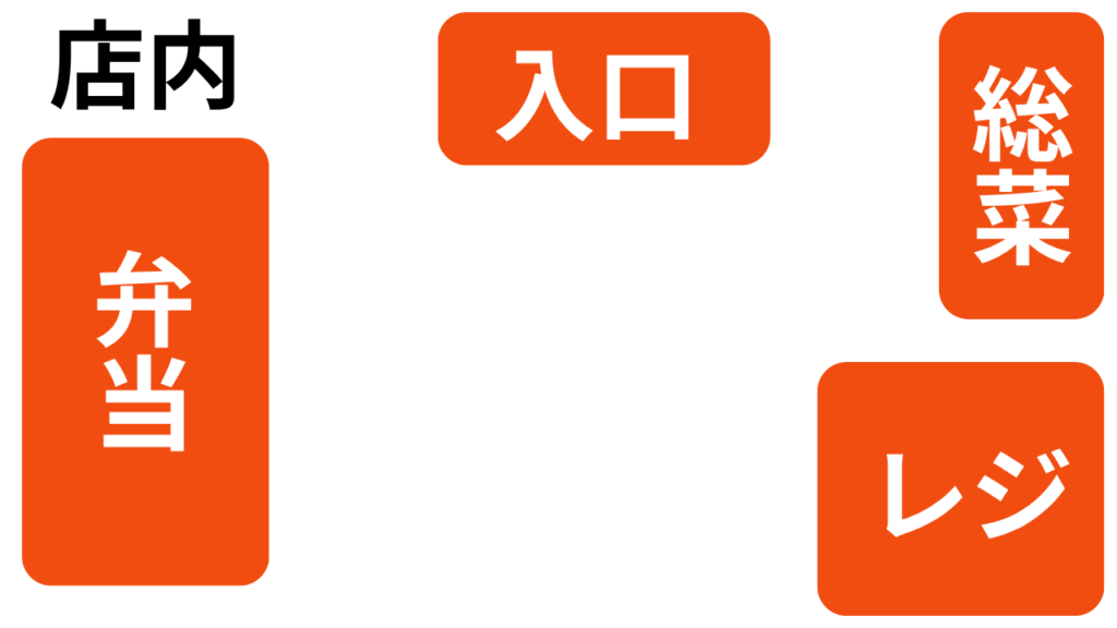 まず店内は上記のような感じです。弁当ゾーンと総菜ゾーンが分けられています。