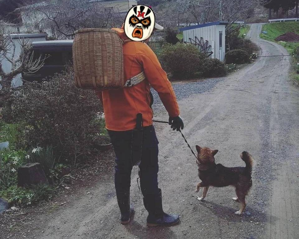 マスブチ仮面は山菜取りが大好き。愛犬と一緒に山にいくことが結構あるのよ。(山菜取りの許可は取っています)