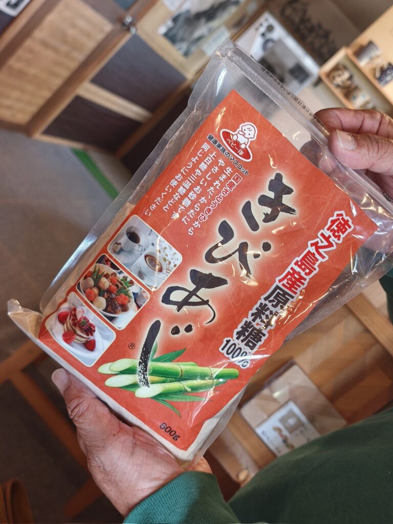 これはキビ和糖(きびわとう)といって、さとうきびからつくられている砂糖なんですよ!食べてみてください。