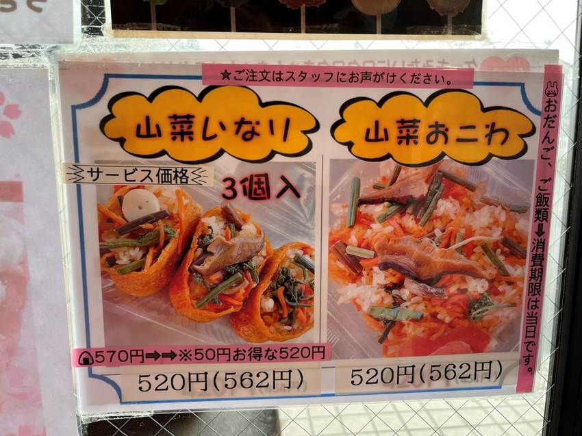 おだんごのほかにいなりやおこわもとりそろえており、おだんごと並ぶ人気商品です。