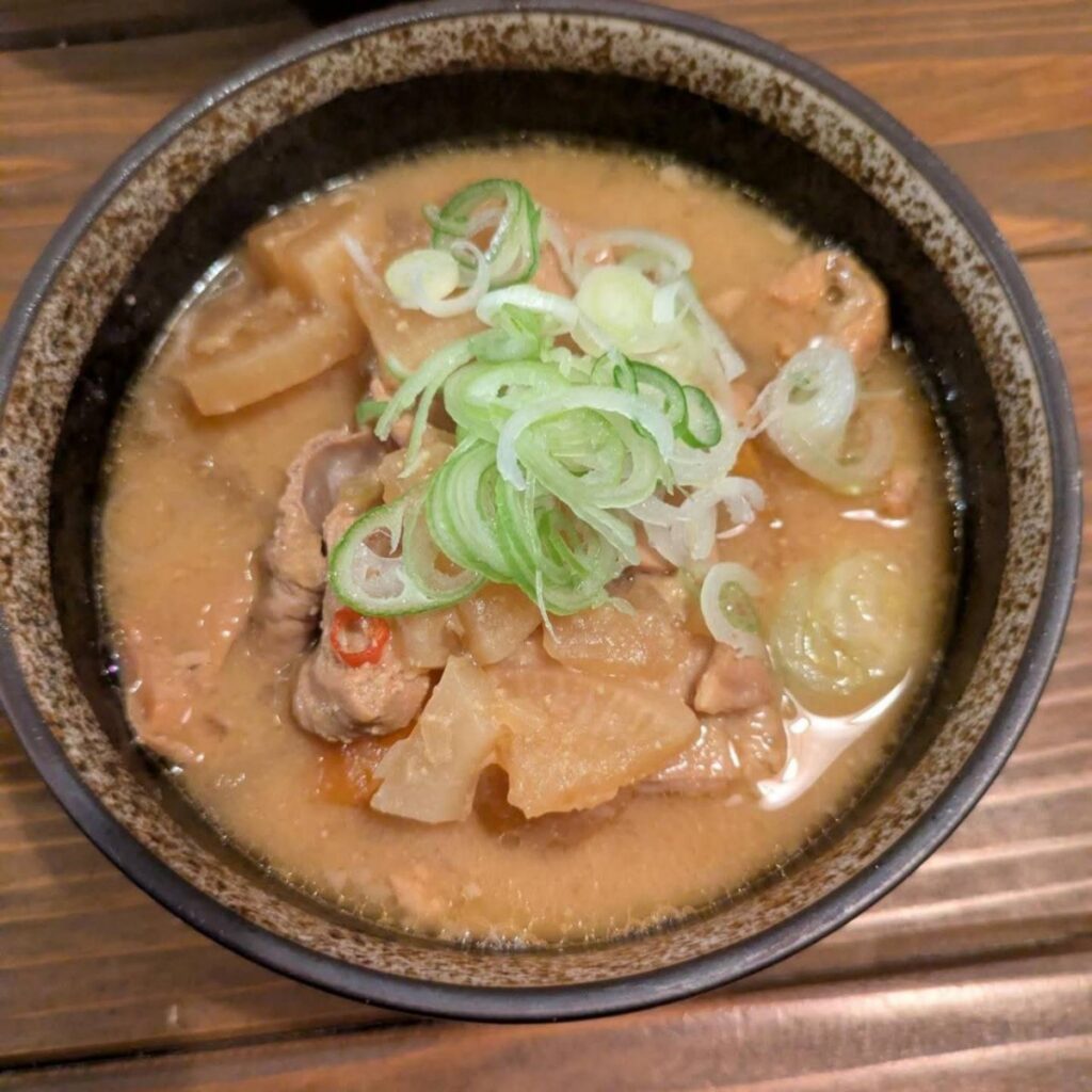 濃いめの味噌ベースの汁がもつにしみ込んで…ガツンとうまい!もつがゴロゴロ入っていて、これ1つでお腹が落ち着くくらいのボリューム。